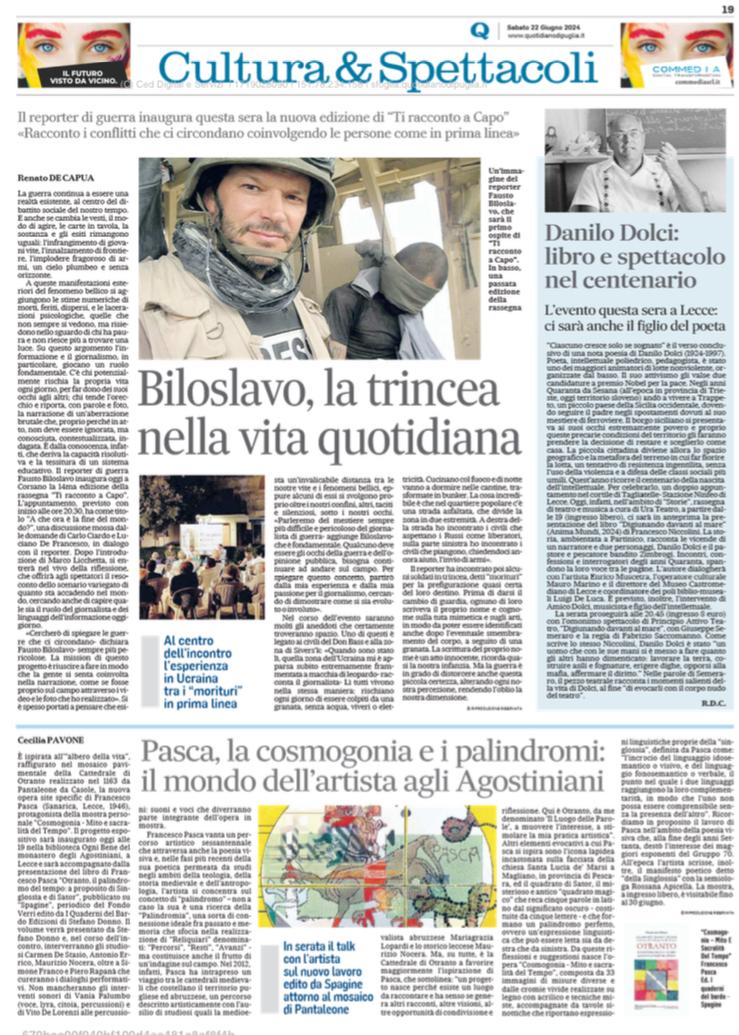 L’apertura vedrà protagonista Fausto Biloslavo, veterano del giornalismo di guerra, che sabato 22 giugno alle 20:30 in Piazza Santa Teresa a Corsano discuterà sul tema A che ora è la fine del mondo?... [continua]