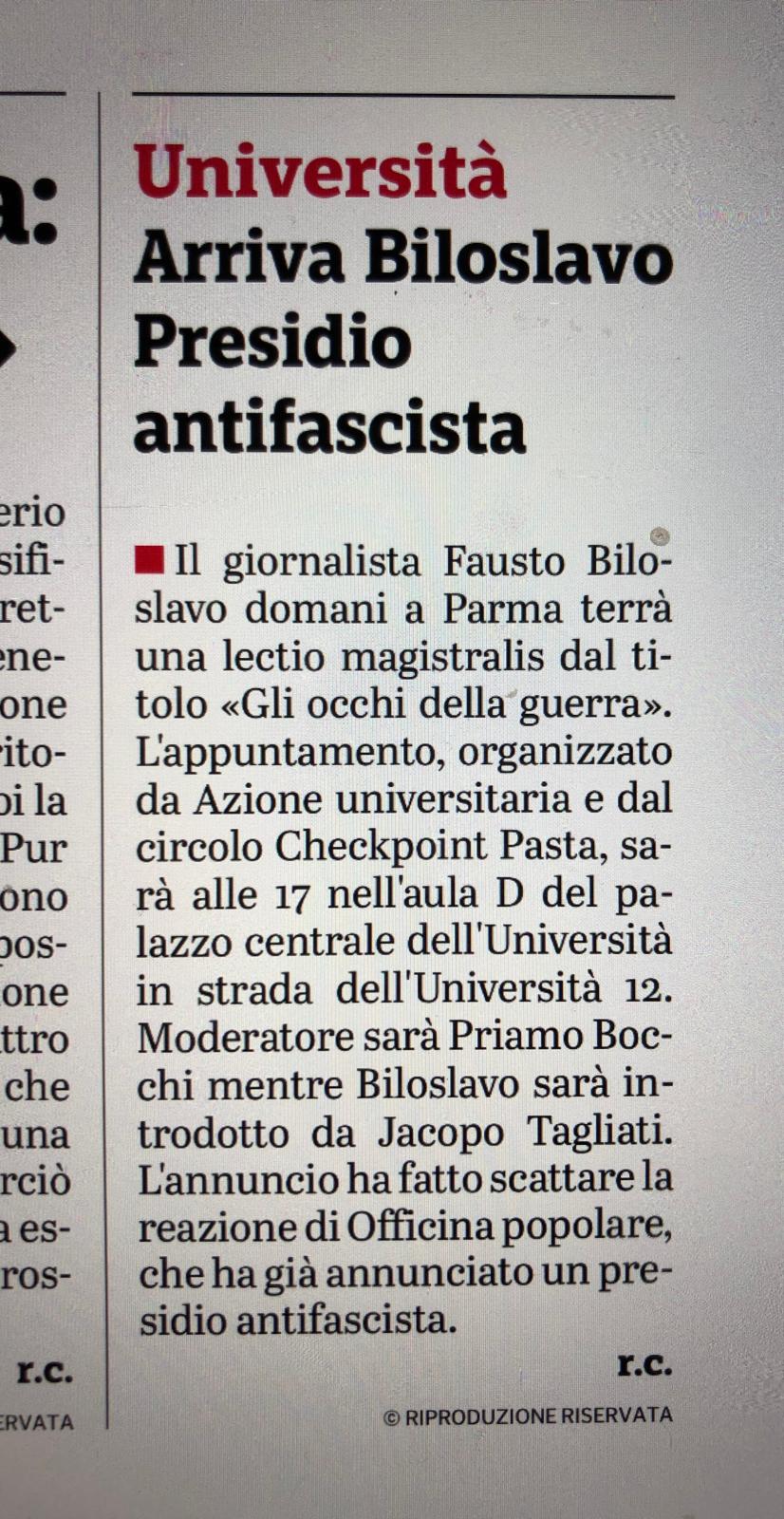 L'aririvo di Biloslavo ha fatto scattare la reazione di Officina popolare che ha già annunciato un presidio antifascista... [vai all'allegato]